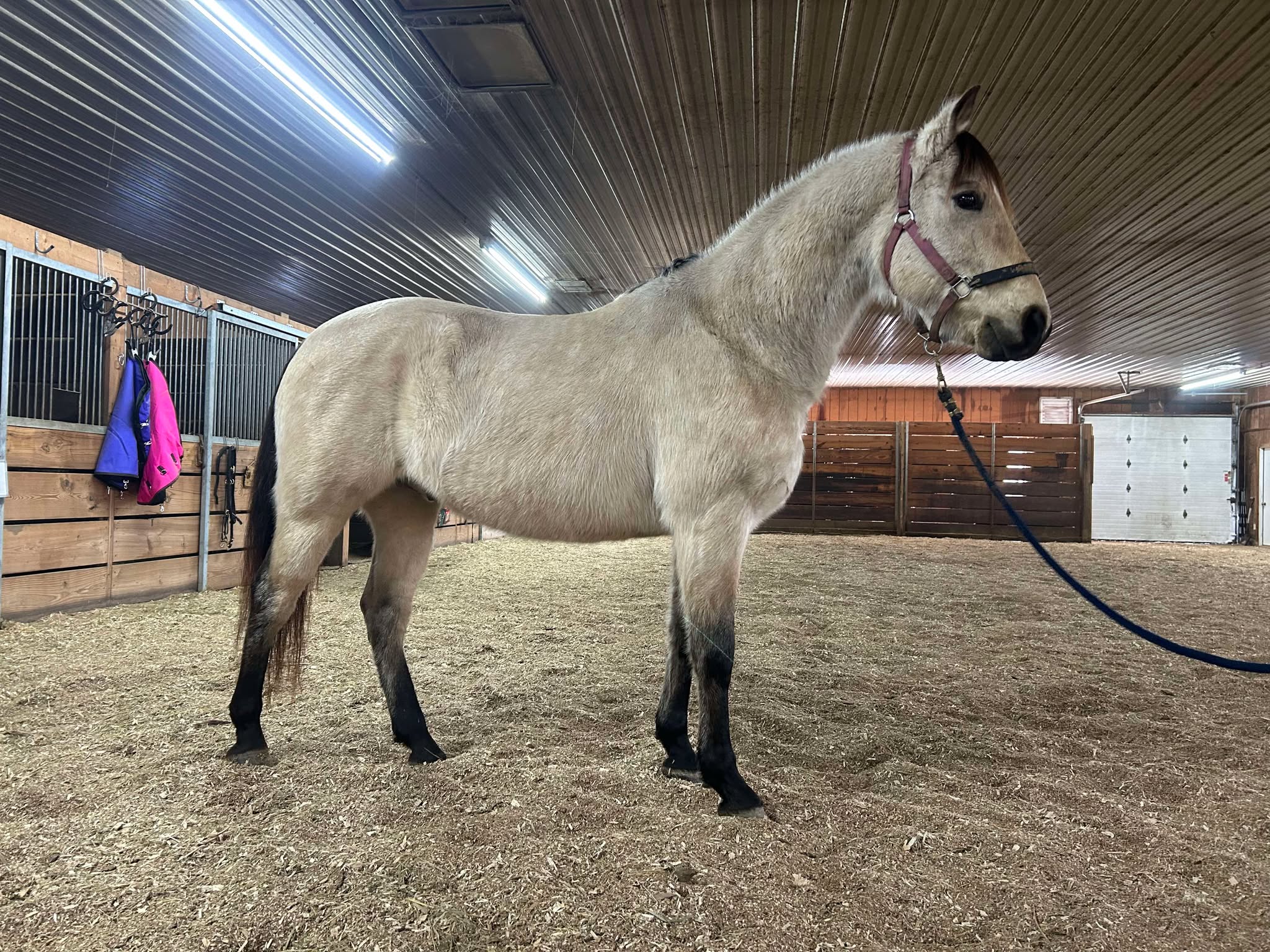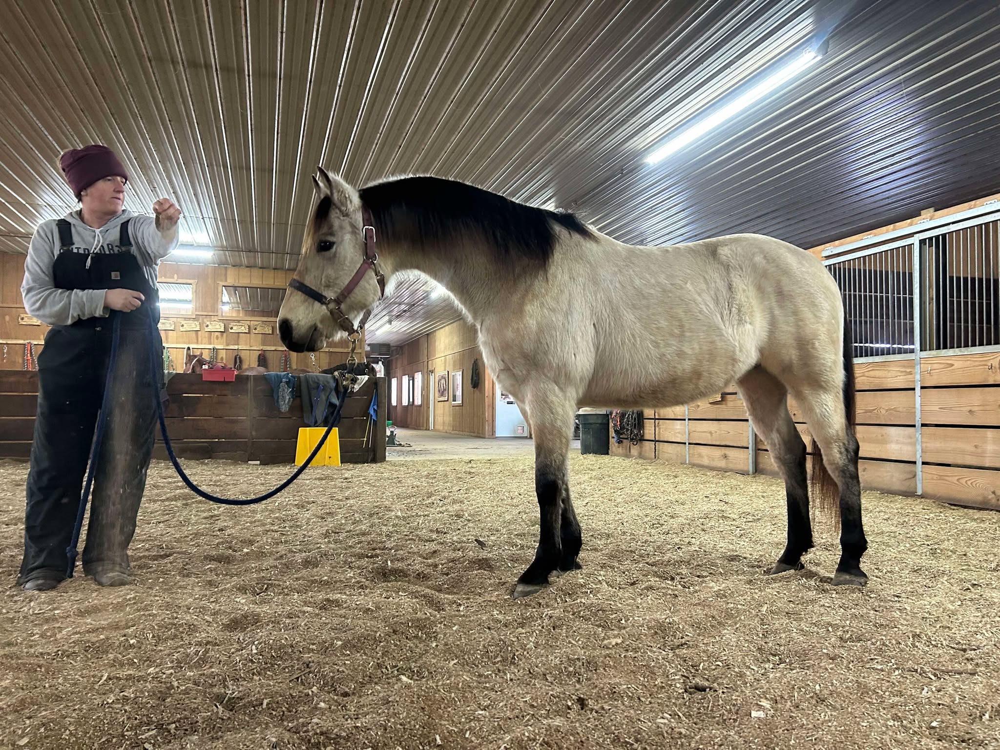 Richard is a 15.2hh buckskin gelding who was foaled in approximately 2016. We don’t know anything about his breeding, unfortunately. Richard is gelded but still retains a lot of studdy behaviors. He also has an issue with sight (cloudiness from cataracts due to past trauma) so will need an adopter who has experience with horses with sight limitations and also experience with stallions. We don’t know a lot about Richard’s past but it definitely included some trauma along the way. He still exhibits some aggressive and self-protective behaviors. He is a beautiful gelding with potential for a confident, experienced person who has the knowledge to continue working with him. He is broke to ride and is good on trails, but does not like arena work. If you are an experienced horse-person interested in learning more about Richard, you can email us at info@mnhoovedanimalrescue.org for more info and contact number.