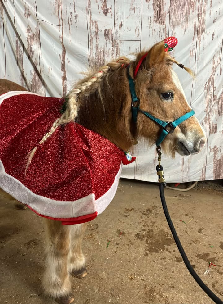 This adorable girl is Katie, a mini mare who came to MHARF last month as an owner surrender. Katie is approximately 15 years old and she stands 39″ tall. She has been having some adventures in her foster home over the past few weeks, including getting all dressed up for a 4H holiday event where she was fantastic! Thank you so much to Sarah and her helpers forgetting to know Katie so we can provide the most accurate info to potential adopters.This is what Sarah has to sat about her: