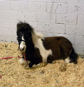 Bruce is a 2024 miniature horse who came to us from a January 2025 Carlton County case in which we assisted an owner to surrender horses after multiple fines for loose livestock and inability to provide secure fencing. He was a stallion at intake but has now received his initial intake veterinary care and has been gelded. He has now been adopted by his foster provider.