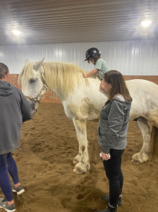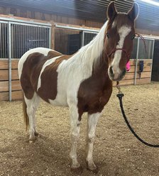 Cass is a pinto gelding who was foaled in approximately 2011. He came to MHARF in Oct. 2024 as an owner surrender due to the sale of the farm where he was living. Cass’s herd-mate died this past summer and with that and other things, he has experienced some stress. He is very happy to now be with other horses again. We gave him some time to settle in and have all of his veterinary care updated before we began his training assessment.
