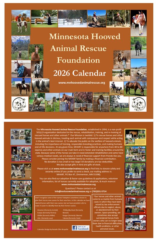 The 2026 MHARF Calendar is now available for pre-order! This is a full-color, spiral bound, twelve-month calendar full of photos and stories of horses who have come through the MHARF program. Calendars will begin shipping the end of November.  Purchase Here!